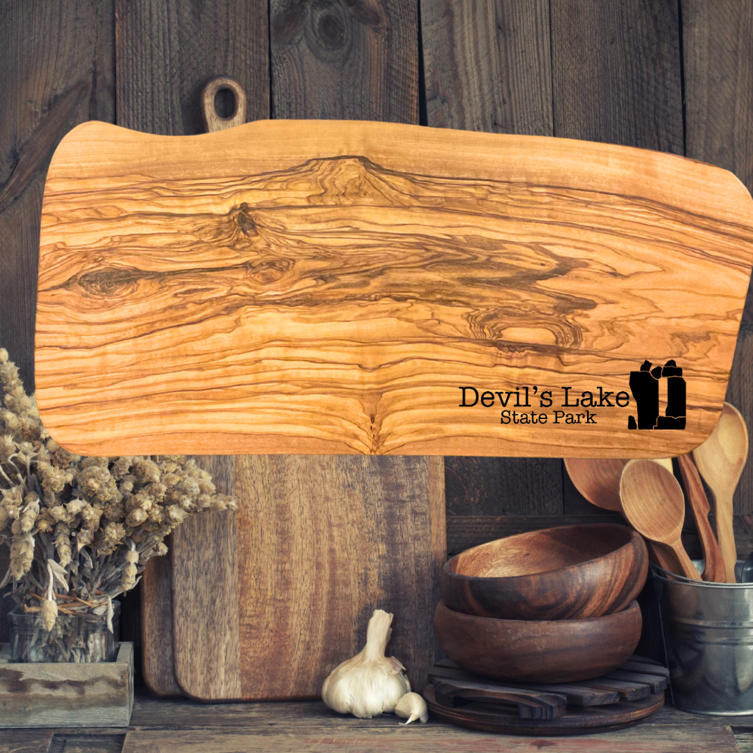 Add a touch of rustic charm to your kitchen with our Devil’s Lake Olive Wood Serving Board. Featuring an engraved Devil’s Lake State Park logo, this all natural board is perfect for serving your favorite dishes. Bring adventure to your meals with this must-have kitchen accessory!