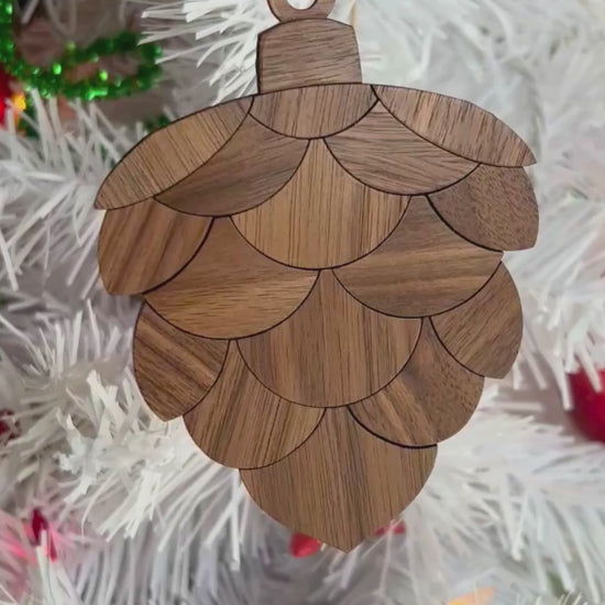Elevate your holiday tree with our Wood Grain Pinecone Ornament. Handcrafted with walnut, each piece highlights the natural grain and is finished with a glossy touch. Add a touch of artistry and sophistication to your holiday decorations.